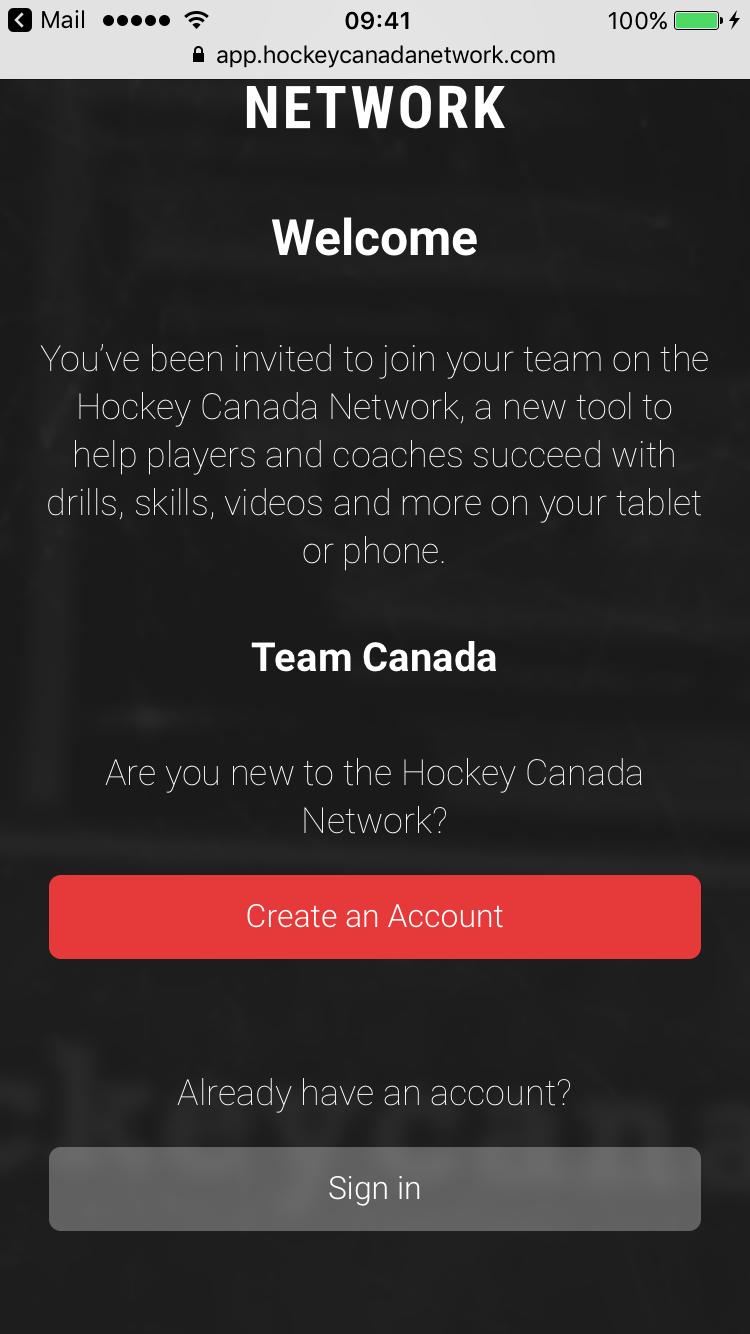 The link will redirect you to your mobile browser. You can create an account from here or sign in with your existing Hockey Canada Network account. If you have not created an account yet and need help doing so, please read our article here.